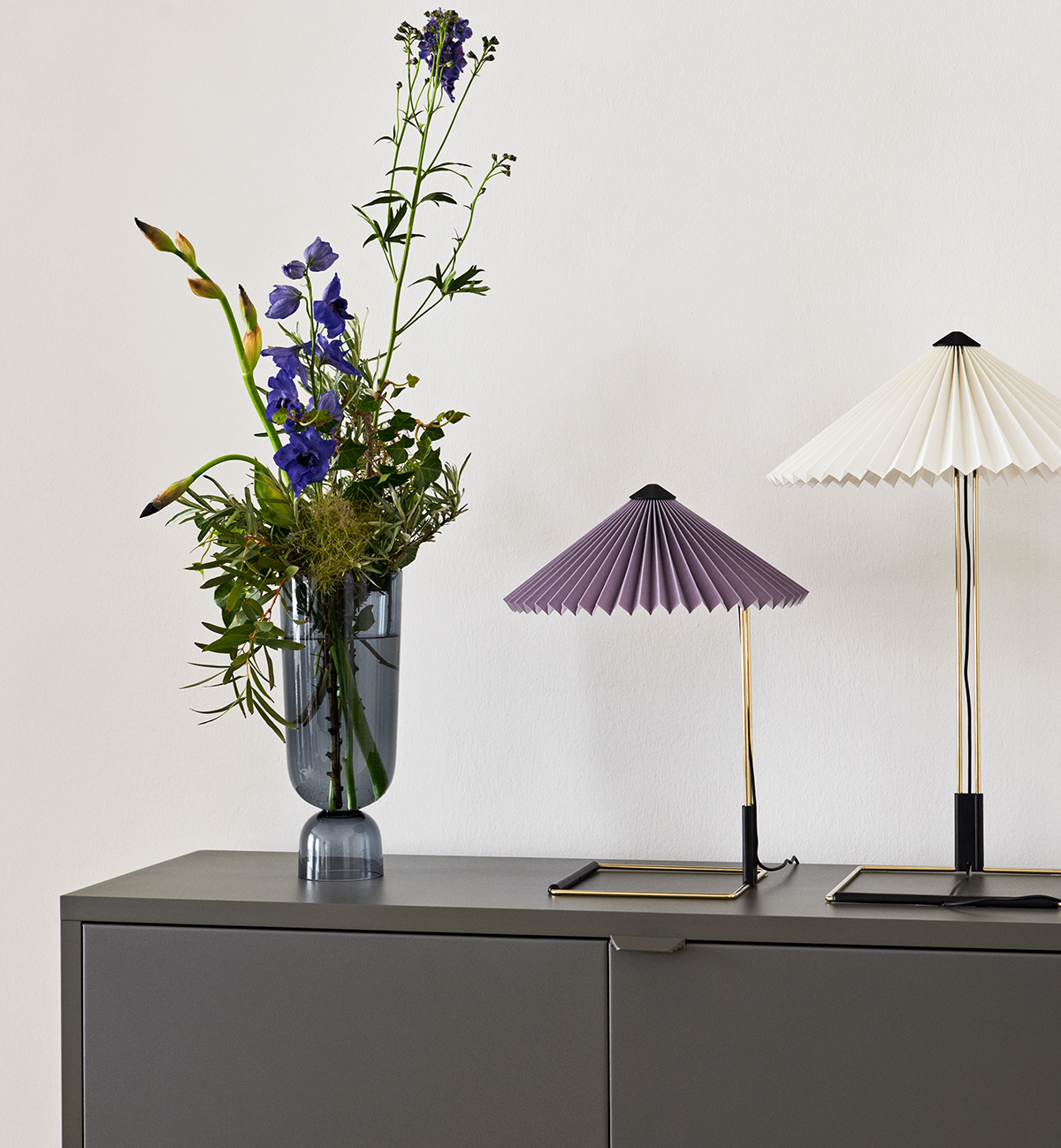 Das Design der Matin Tischleuchte von Inga Sempé hat einen poetischen Touch und kombiniert eine visuelle Leichtigkeit mit einer konstruktiven Robustheit. Der Rahmen besteht aus poliertem Messing mit mattschwarzen Elementen und der PVC-Schirm ist mit einem farbigen Baumwollbezug kaschiert. Als Lichtquelle dienen integrierte, dimmbare LEDs in warmweiß, deren Licht durch den Lampenschirm nach unten scheint.