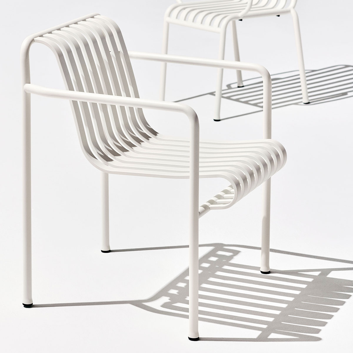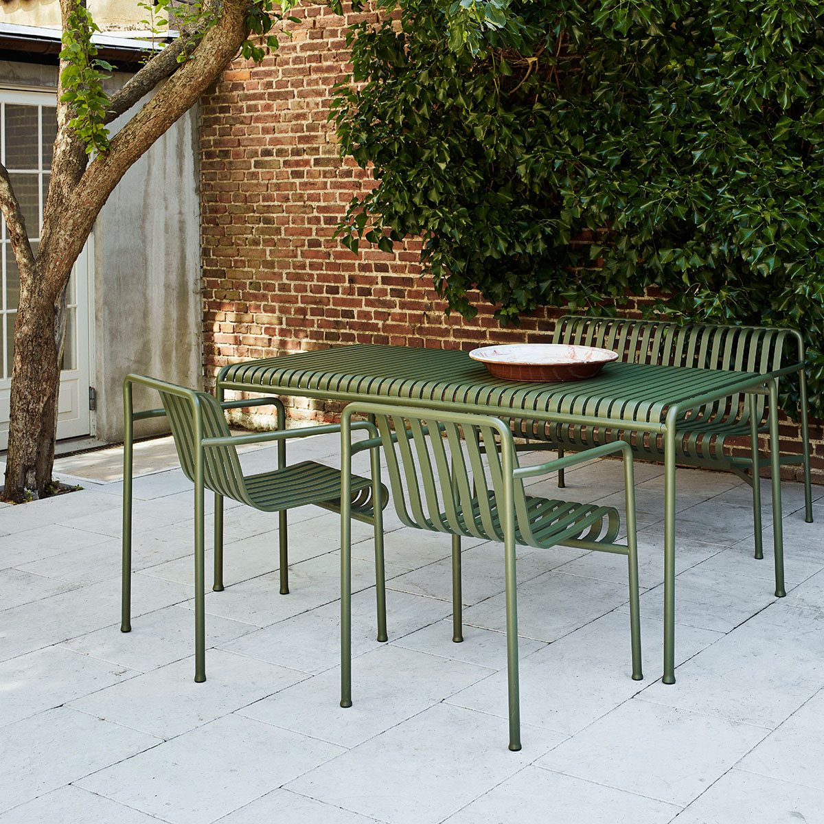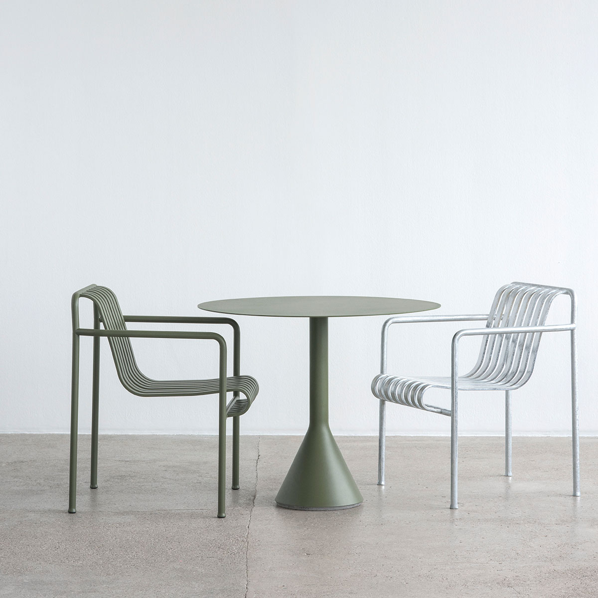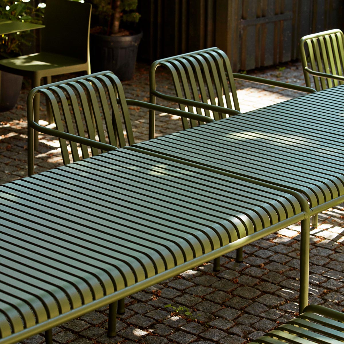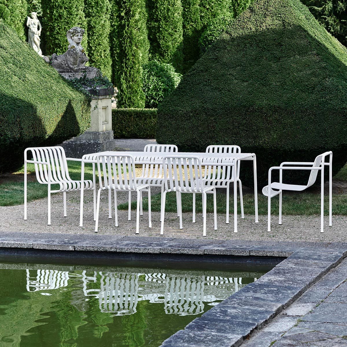 Die Palissade Außenmöbel-Kollektion wurde für Hay von Ronan und Erwan Bouroullec unter der Prämisse einer vielfältigen Anwendbarkeit entworfen: Im Café, im Restaurant, im Garten, auf der Terrasse oder auf dem Balkon. Die Kollektion aus Hockern, Bänken, Stühlen und Tischen umfasst 13 verschiedene Elemente, die nicht nur in ihrer grafischen Form, sondern auch im Hinblick auf ihre funktionalen Charakteristika vereint sind: Robust ohne klobig zu wirken, elegant ohne fragil zu sein.