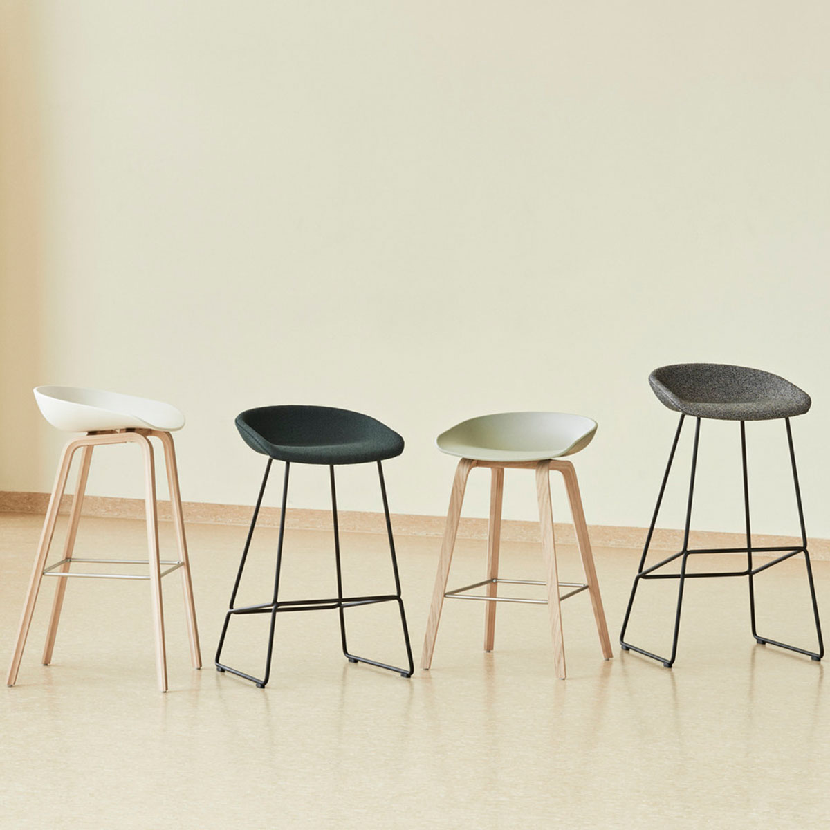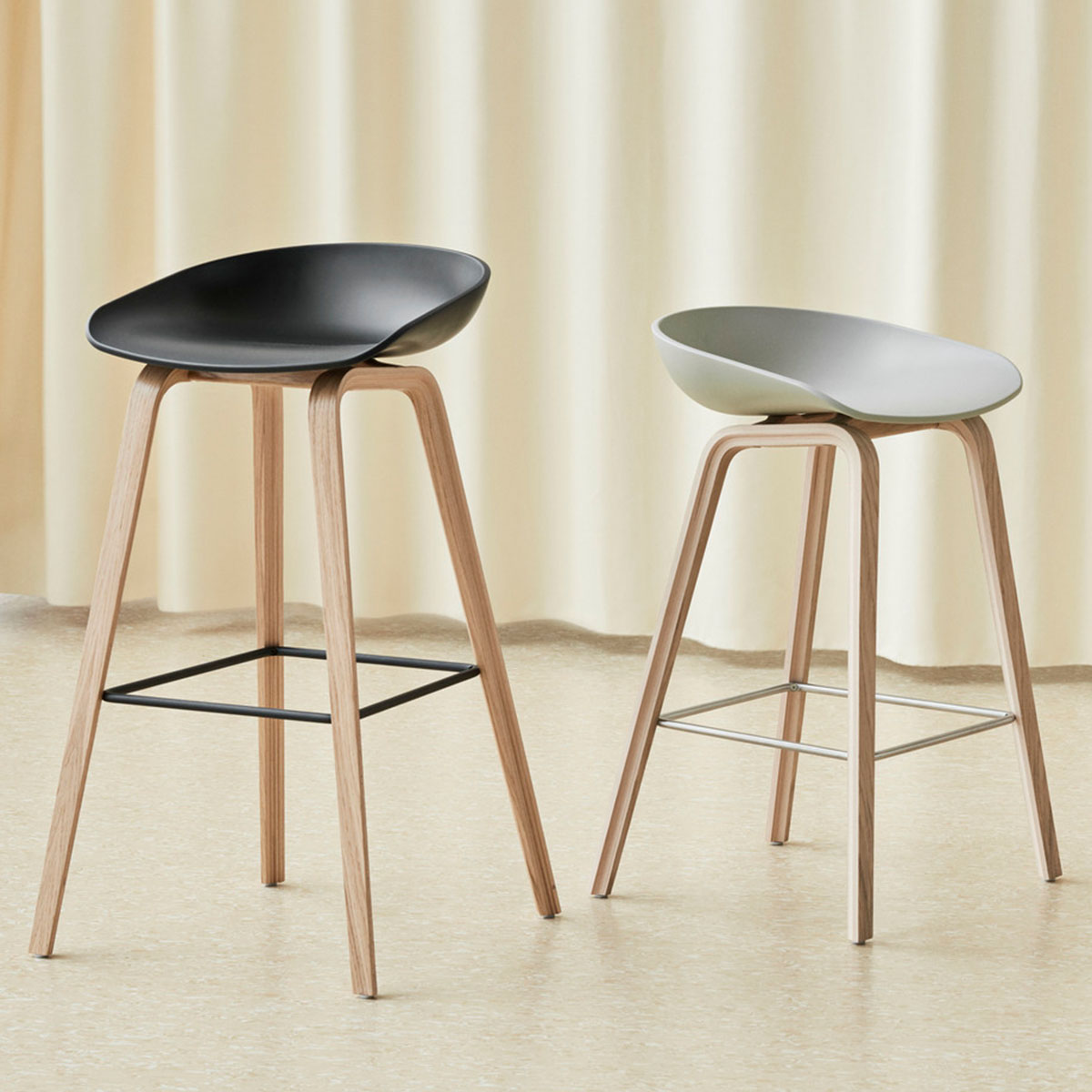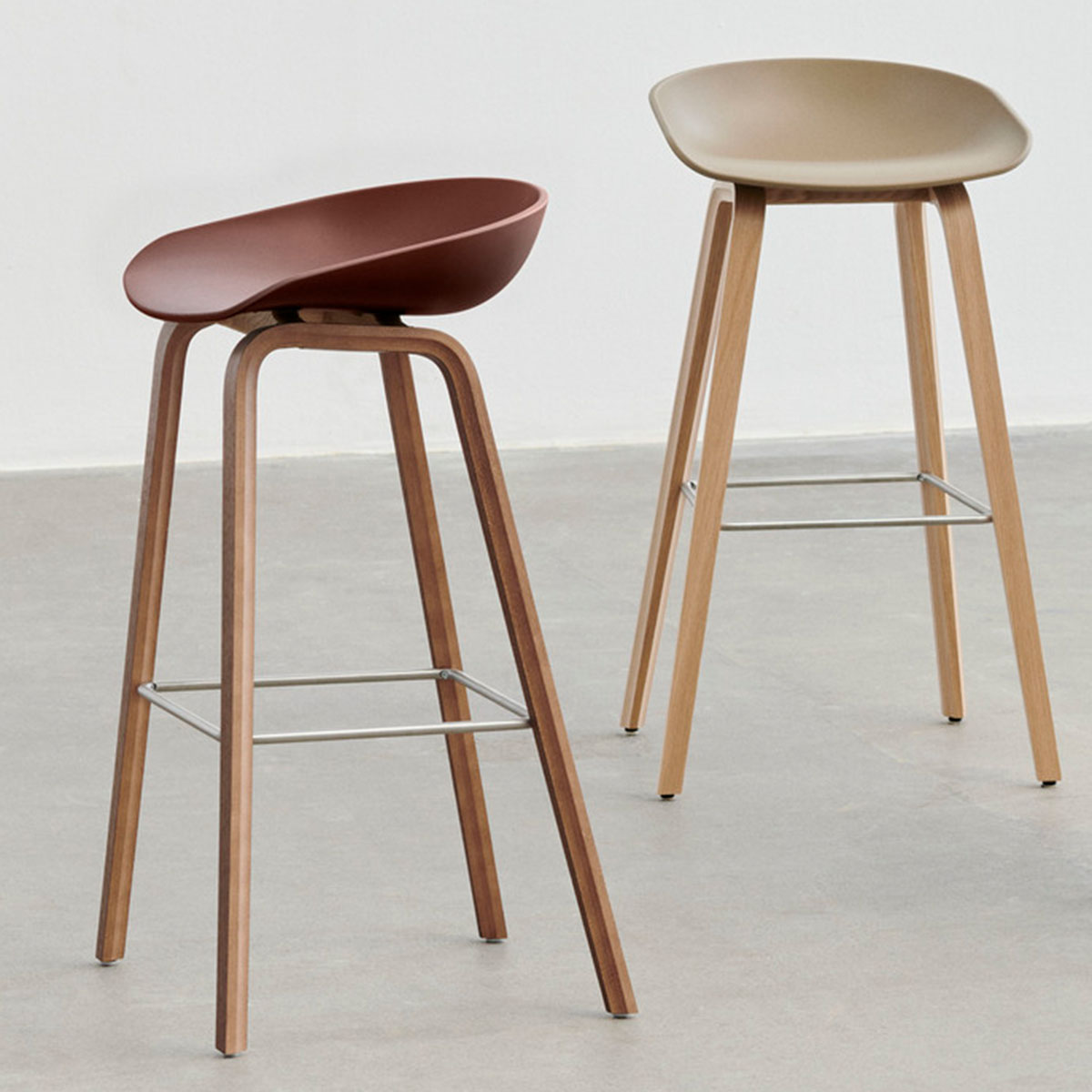 Mit einer geschwungenen Rückenlehne und langen, eleganten Holzbeinen hat der Hay About A Stool AAS 32 das gleiche vielseitige Profil wie die anderen Designs der Kollektion. Der Sitz aus recyceltem Post-Consumer-Kunststoff wird in einer breiten Palette moderner Farben angeboten, wobei die Beine in zwei Höhen und in verschiedenen Holzausführungen erhältlich sind. Die schlichte, aber starke visuelle Präsenz der Serie macht sie ideal als Barhocker in verschiedenen geschäftlichen, öffentlichen und privaten Kontexten.