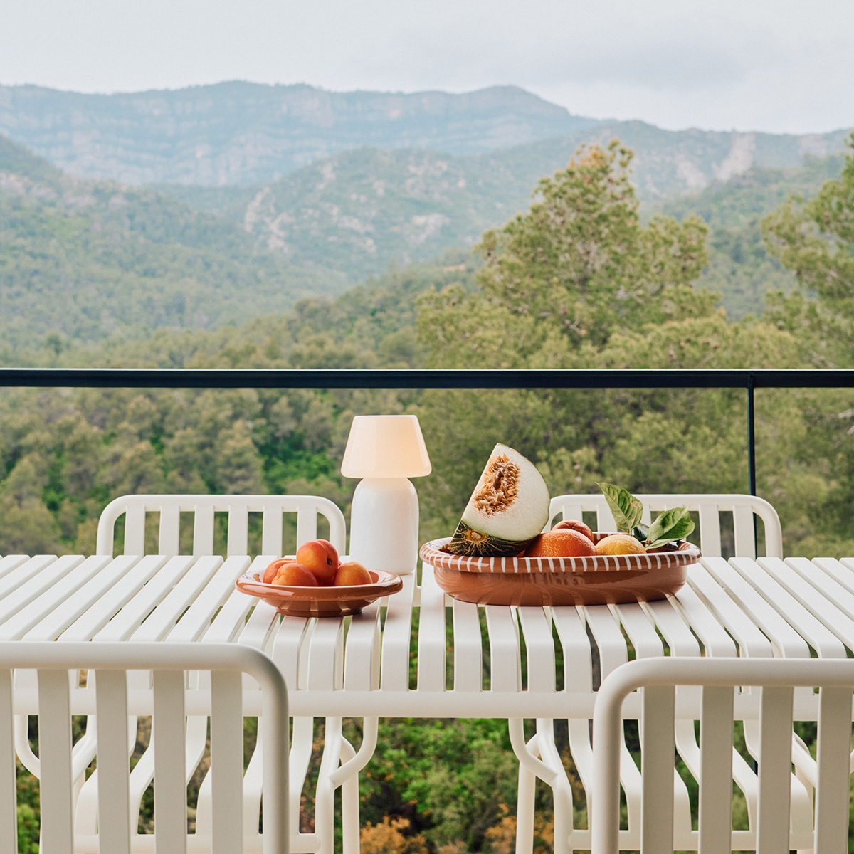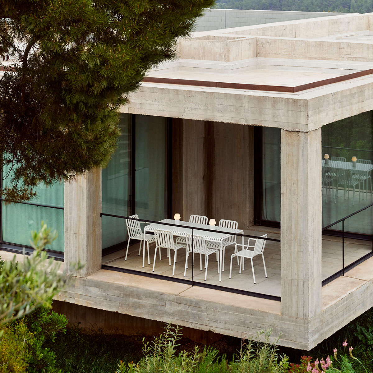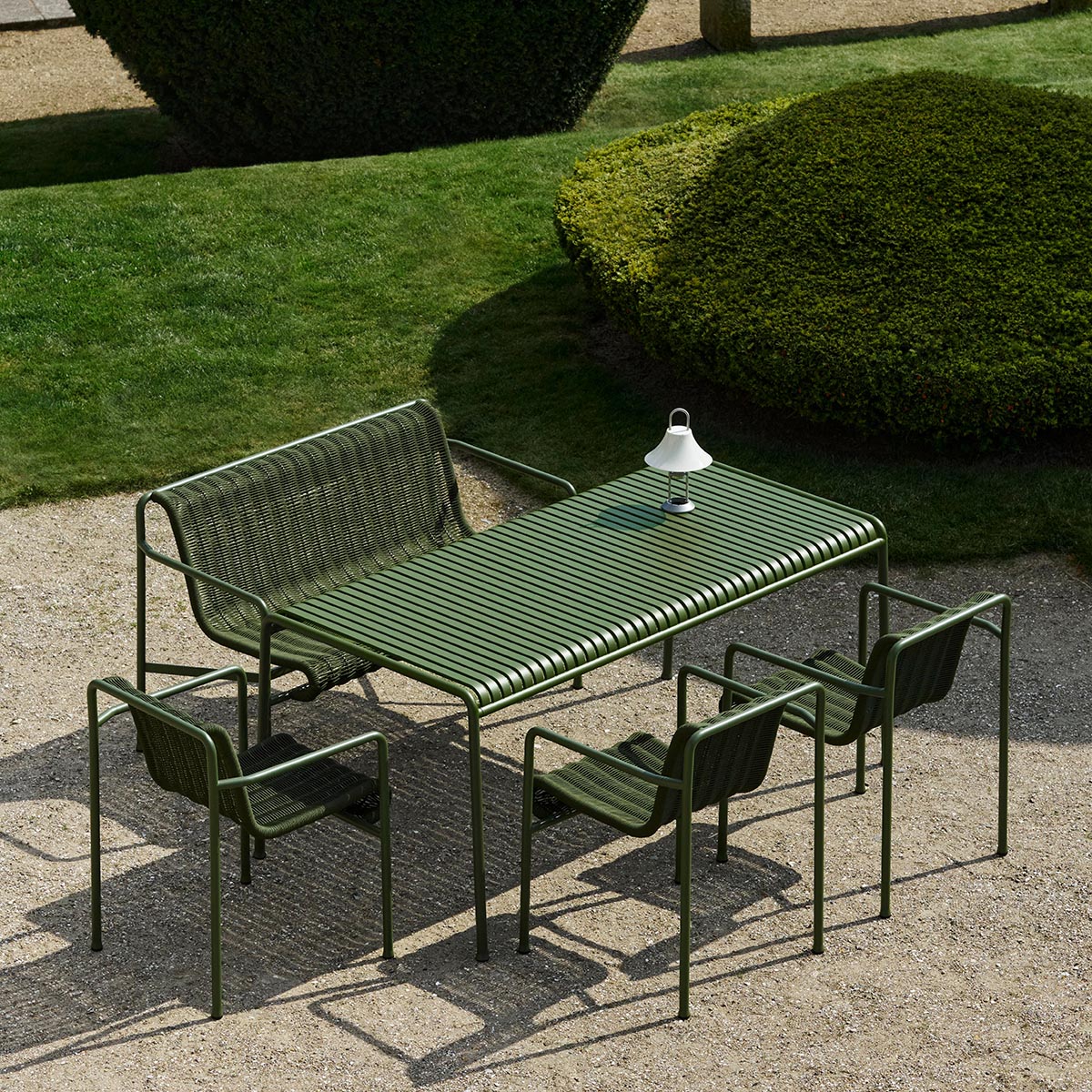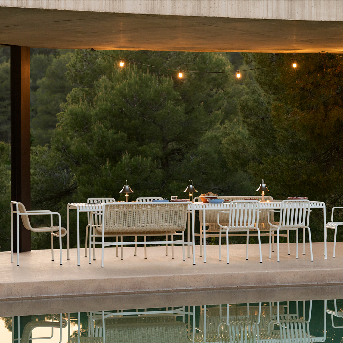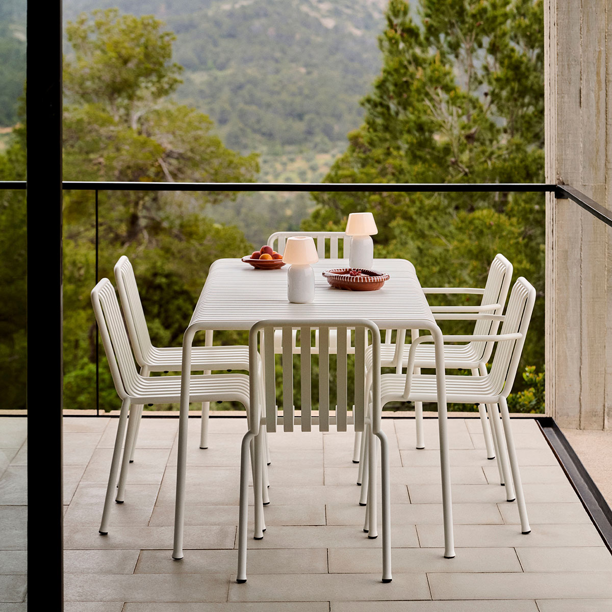 Die Palissade Außenmöbel-Kollektion wurde für Hay von Ronan und Erwan Bouroullec unter der Prämisse einer vielfältigen Anwendbarkeit entworfen: Im Café, im Restaurant, im Garten, auf der Terrasse oder auf dem Balkon. Die Kollektion aus Hockern, Bänken, Stühlen und Tischen umfasst 13 verschiedene Elemente, die nicht nur in ihrer grafischen Form, sondern auch im Hinblick auf ihre funktionalen Charakteristika vereint sind: Robust ohne klobig zu wirken, elegant ohne fragil zu sein.