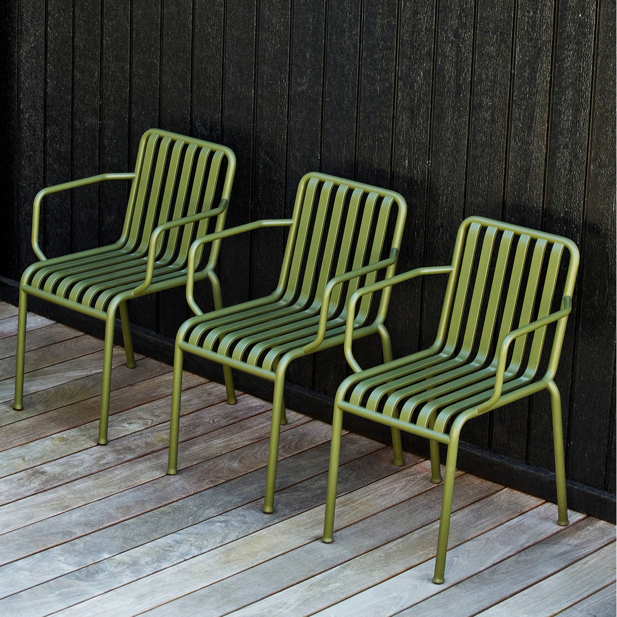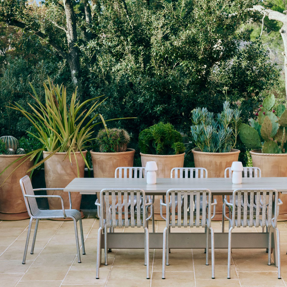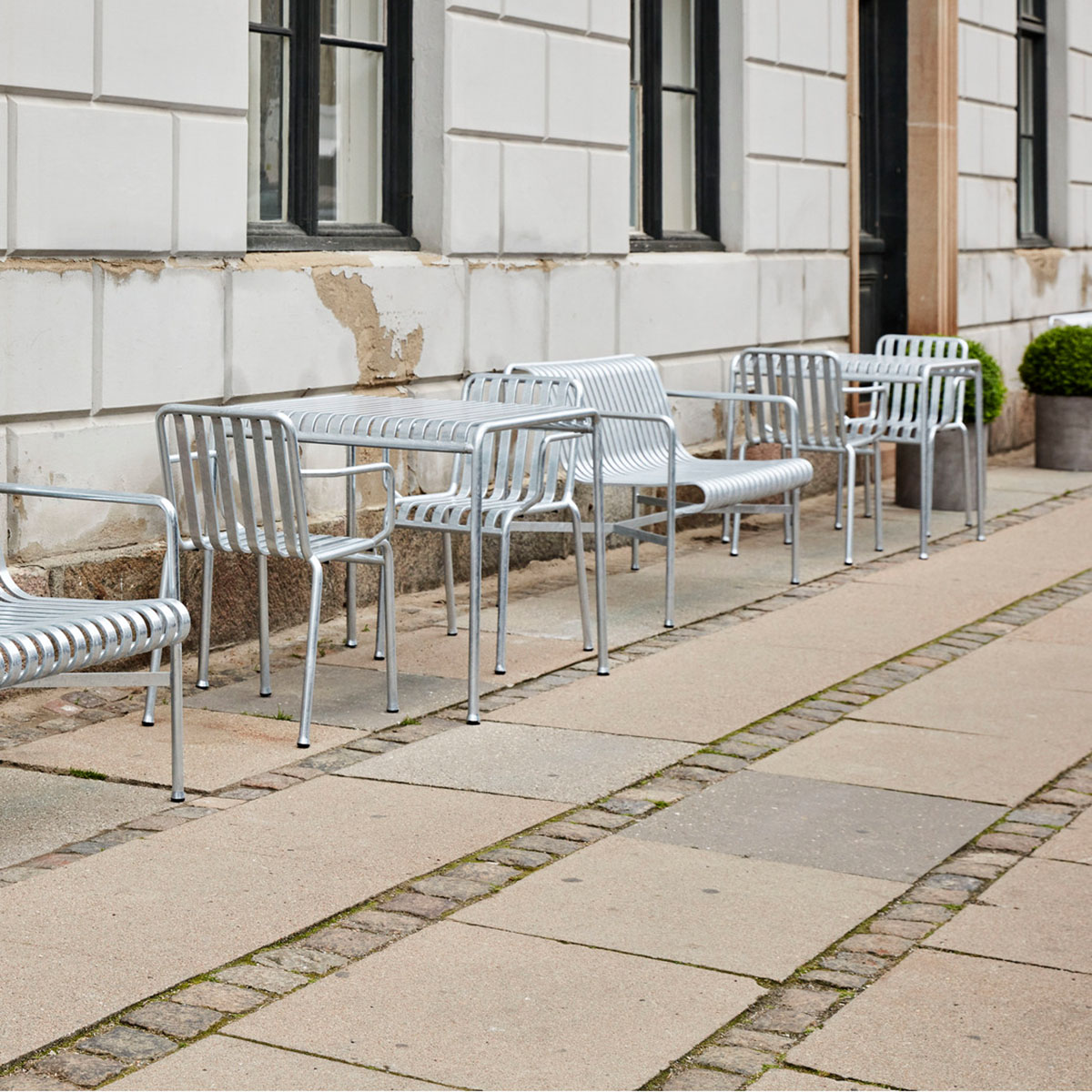 Die Palissade Außenmöbel-Kollektion wurde für Hay von Ronan und Erwan Bouroullec unter der Prämisse einer vielfältigen Anwendbarkeit entworfen: Im Café, im Restaurant, im Garten, auf der Terrasse oder auf dem Balkon. Die Kollektion aus Hockern, Bänken, Stühlen und Tischen umfasst 13 verschiedene Elemente, die nicht nur in ihrer grafischen Form, sondern auch im Hinblick auf ihre funktionalen Charakteristika vereint sind: Robust ohne klobig zu wirken, elegant ohne fragil zu sein.