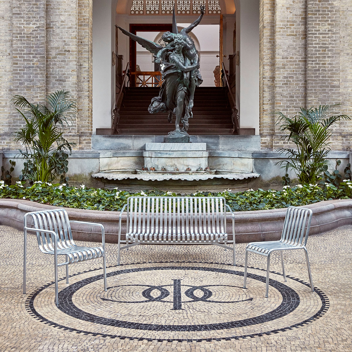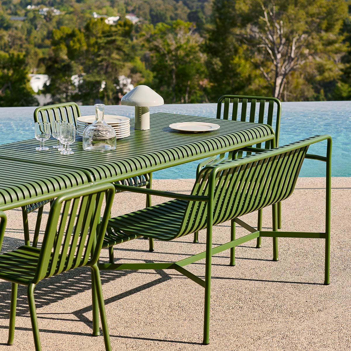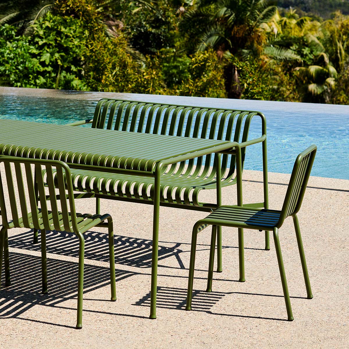 Die Palissade Außenmöbel-Kollektion wurde für Hay von Ronan und Erwan Bouroullec unter der Prämisse einer vielfältigen Anwendbarkeit entworfen: Im Café, im Restaurant, im Garten, auf der Terrasse oder auf dem Balkon. Die Kollektion aus Hockern, Bänken, Stühlen und Tischen umfasst 13 verschiedene Elemente, die nicht nur in ihrer grafischen Form, sondern auch im Hinblick auf ihre funktionalen Charakteristika vereint sind: Robust ohne klobig zu wirken, elegant ohne fragil zu sein.