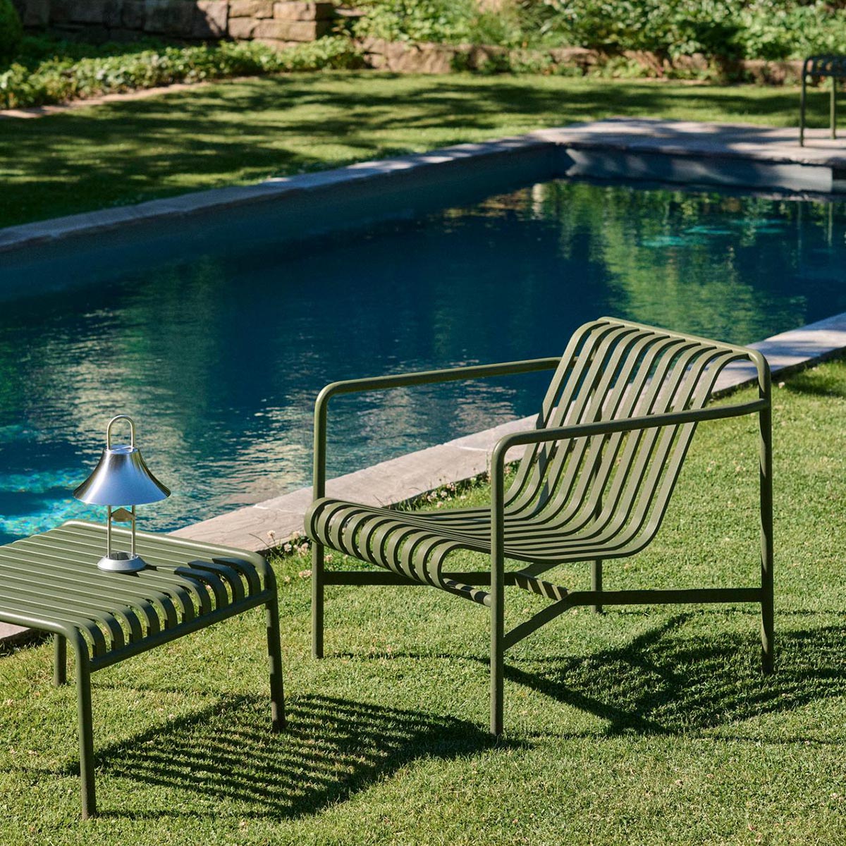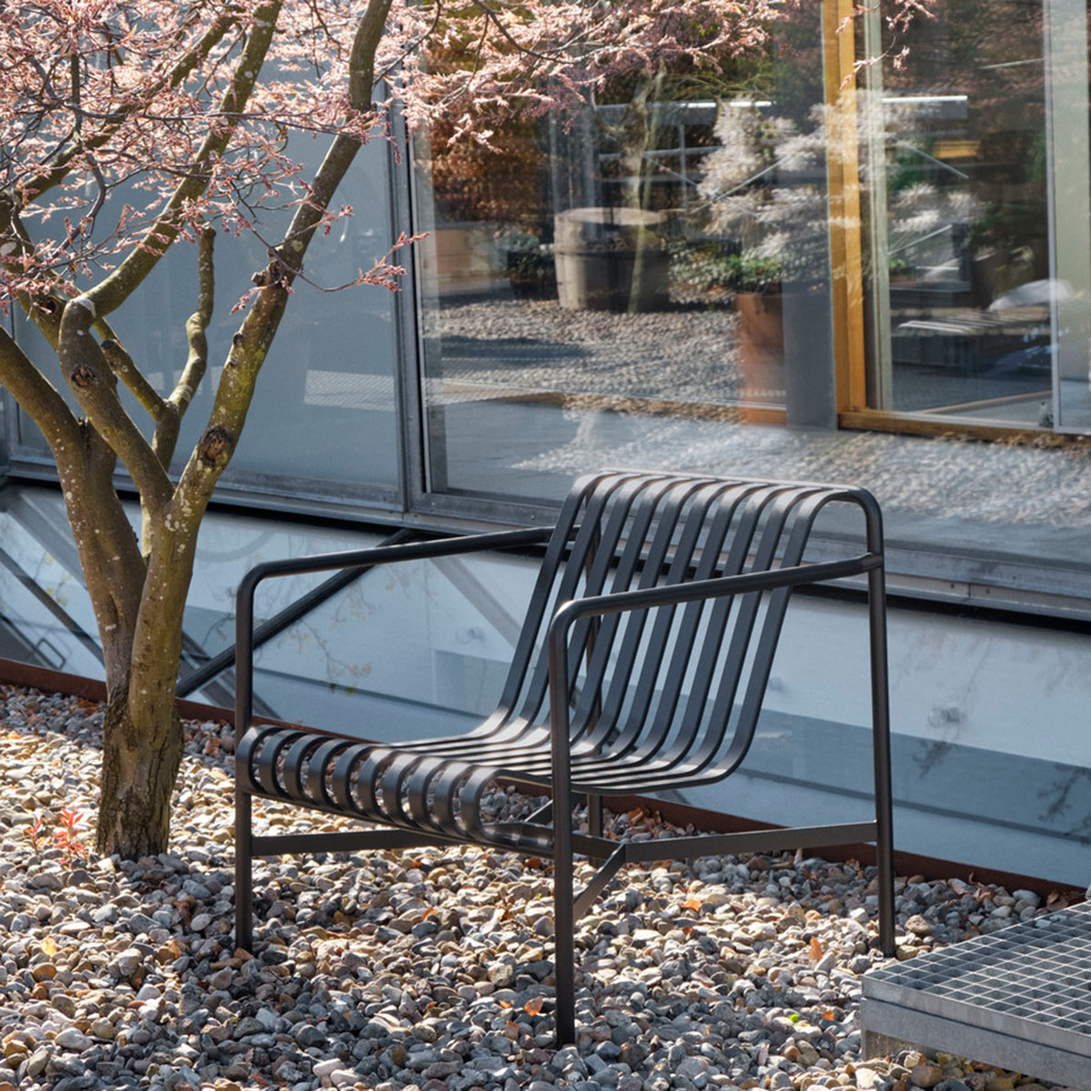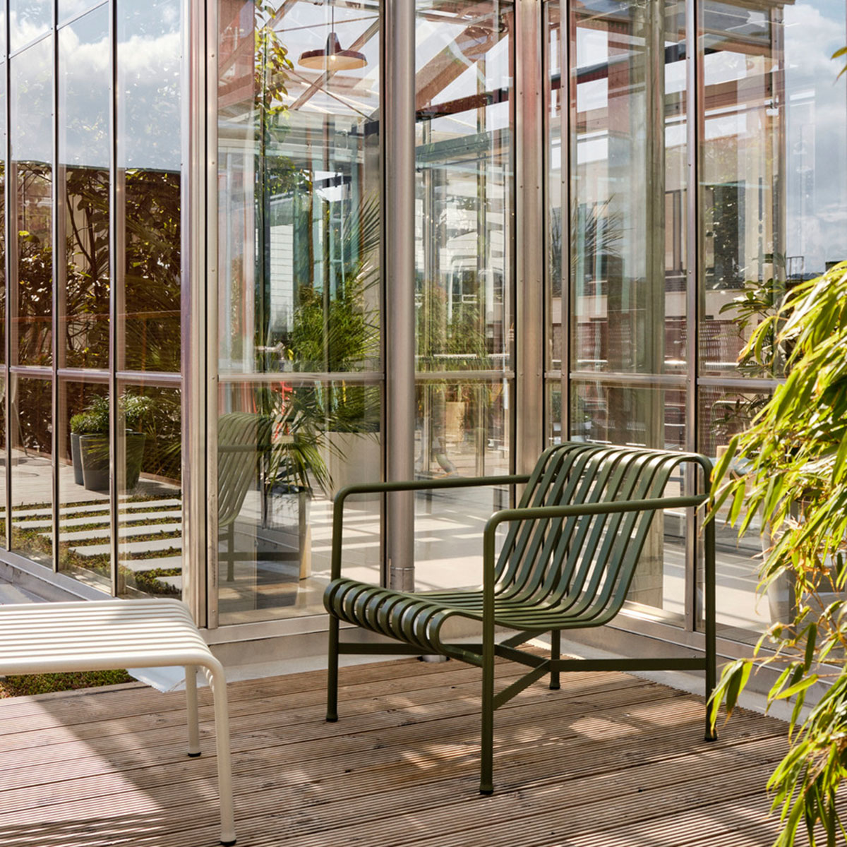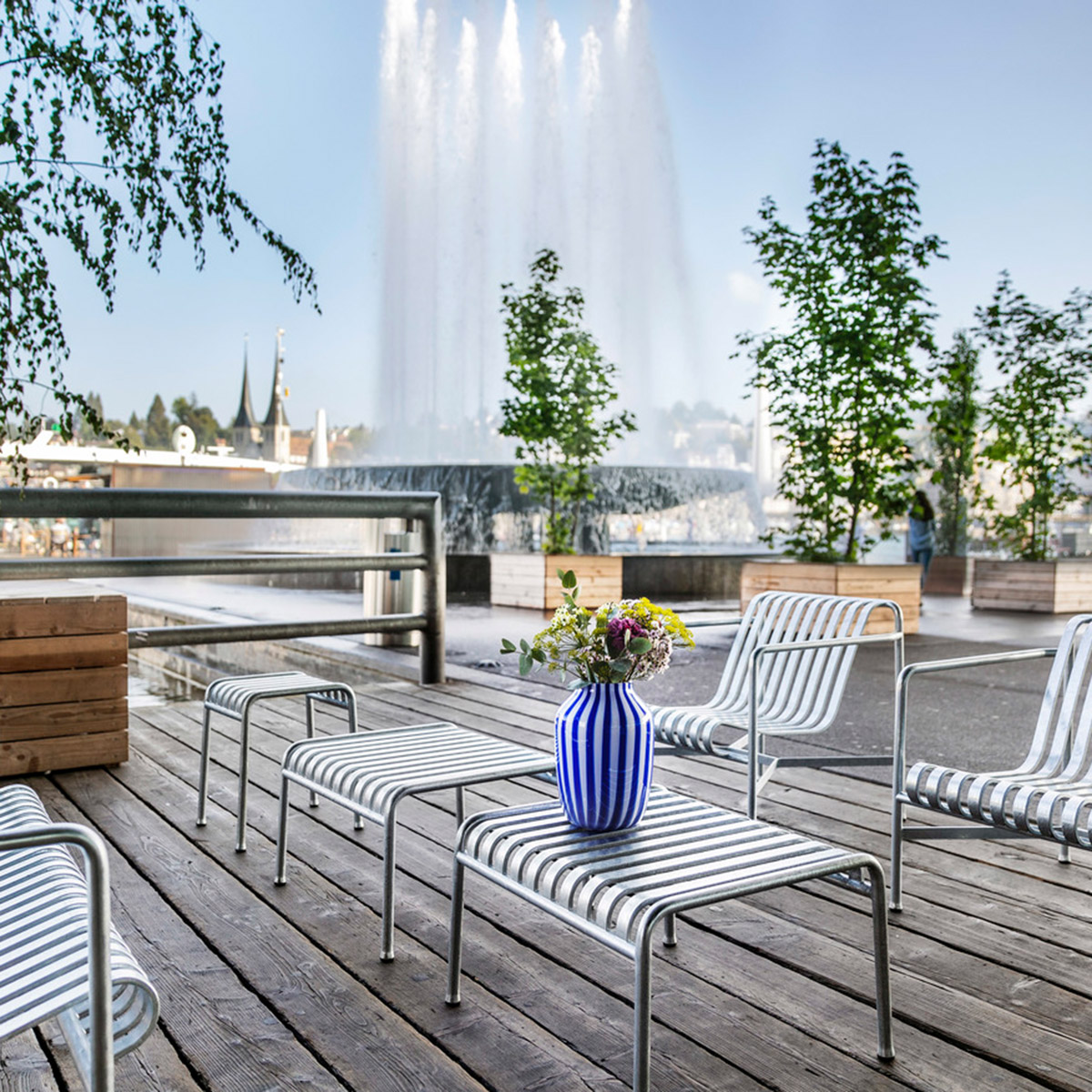 Die Palissade Außenmöbel-Kollektion wurde für Hay von Ronan und Erwan Bouroullec unter der Prämisse einer vielfältigen Anwendbarkeit entworfen: Im Café, im Restaurant, im Garten, auf der Terrasse oder auf dem Balkon. Die Kollektion aus Hockern, Bänken, Stühlen und Tischen umfasst 13 verschiedene Elemente, die nicht nur in ihrer grafischen Form, sondern auch im Hinblick auf ihre funktionalen Charakteristika vereint sind: Robust ohne klobig zu wirken, elegant ohne fragil zu sein.