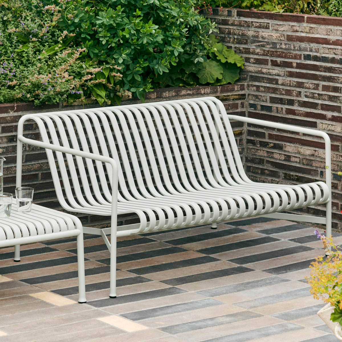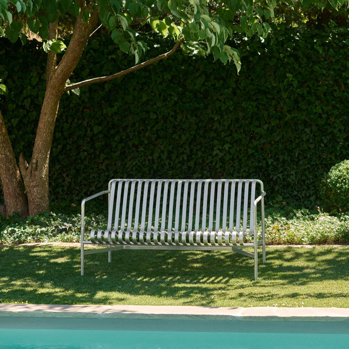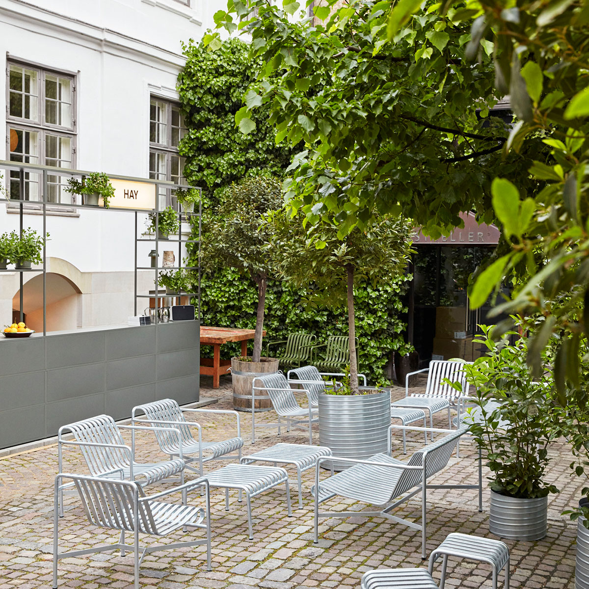 Die Palissade Außenmöbel-Kollektion wurde für Hay von Ronan und Erwan Bouroullec unter der Prämisse einer vielfältigen Anwendbarkeit entworfen: Im Café, im Restaurant, im Garten, auf der Terrasse oder auf dem Balkon. Die Kollektion aus Hockern, Bänken, Stühlen und Tischen umfasst 13 verschiedene Elemente, die nicht nur in ihrer grafischen Form, sondern auch im Hinblick auf ihre funktionalen Charakteristika vereint sind: Robust ohne klobig zu wirken, elegant ohne fragil zu sein.